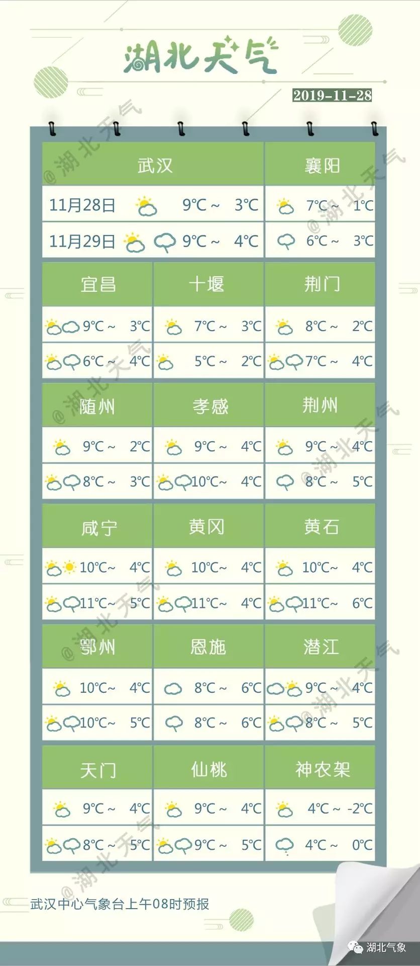 最低气温:鄂西北0-3℃;其他地区3-6℃