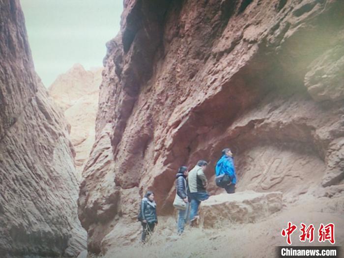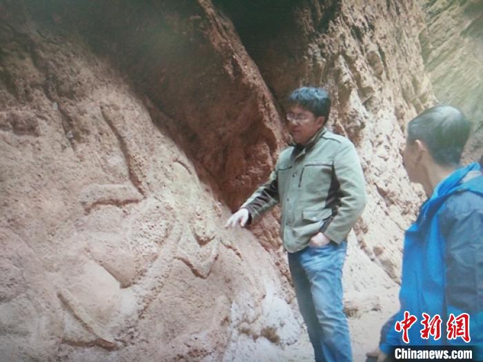 新疆库车大峡谷在崖壁首次发现飞天浮雕壁画。 王建强 摄