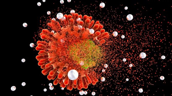 △ 这个美丽的粉红色大球体是我们身体中与免疫力相关的淋巴细胞,而在这颗大球上如同孜然一般“撒满”半个球面的数不清的亮黄色粉状物就是艾滋病病毒颗粒,它们正在缓慢地“吃掉”这个淋巴细胞。