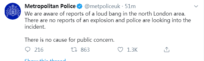 伦敦警察局也在推文上发文证实此事。推文称,伦敦警察局已经注意到有关伦敦北部地区出现巨响的报道。警方正在调查这起事件。公众没必要担心。↓