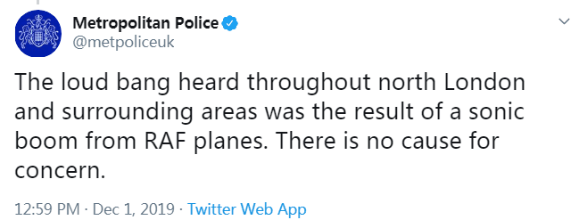 伦敦警方随后证实,巨响系英国皇家空军飞机突破音障时产生的“音爆”。