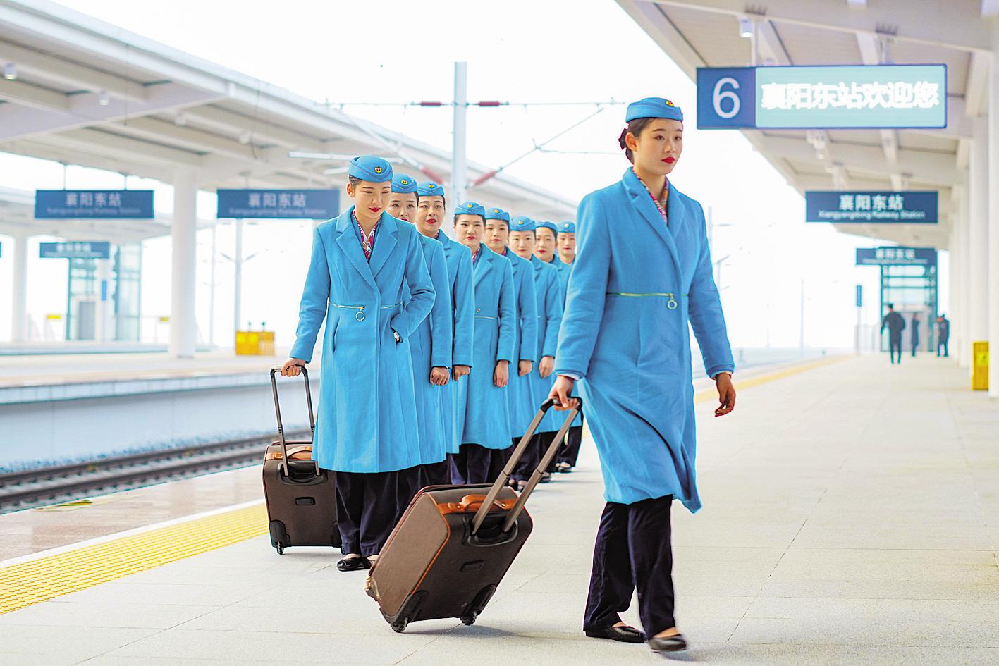 图为:12月1日,襄阳东站首趟郑渝高铁郑襄段G4058次列车乘务员准备上车。(视界网 杨东 张威 摄)