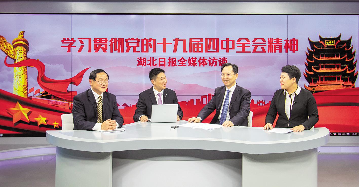 省人大常委会秘书长王亚平(右二)、襄阳市人大常委会主任成佳刚(左一)、省人大代表陈春芳(右一)做客湖北日报全媒体访谈,畅谈学习贯彻党的十九届四中全会精神。(湖北日报全媒记者 魏铼 摄)