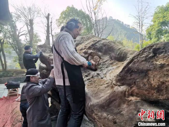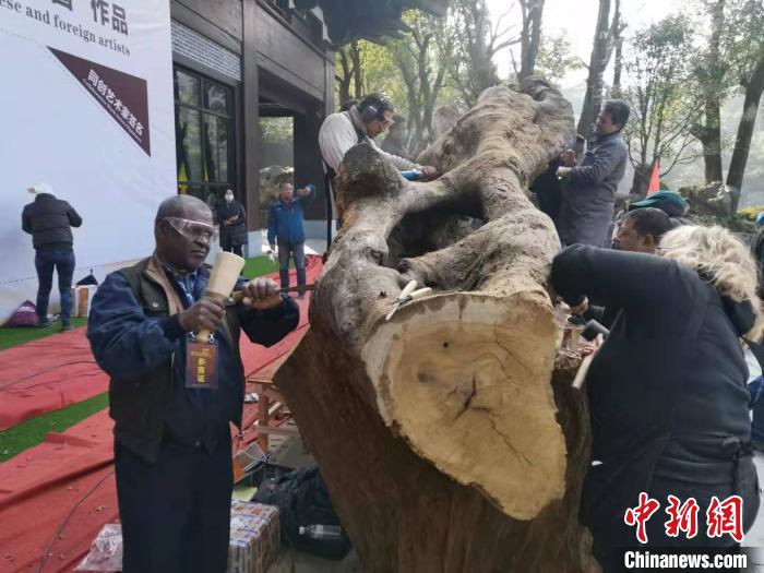 中新网衢州12月2日电(记者 周禹龙)2日,浙江工艺美术大师方义手拿雕刻工具,兴奋地对着长6.5米、重3.5吨的黄心楠根材,进行创作,和他一起创作的还有众多其他国家艺术家。