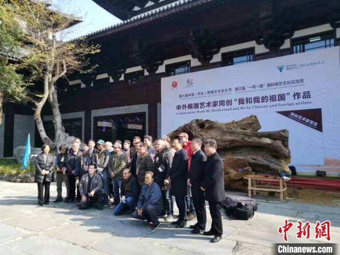 当天,中国根雕现场创作大赛在浙江开化举行。中国、德国、韩国等15国根艺大师,除每人独立创作一件根雕作品外,还以“我和我的祖国”为题,围绕同一件根材,创作大型根雕艺术品。