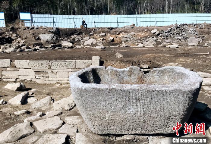 记者在考古发掘现场看到,大湖坪遗址位于福寿山顶的一块平地,四周青山环绕。福寿寺基址明代台基前面由加工规整的条石垒砌而成,最上面一排均有雕花,内容有束莲纹等。遗址北部的高台上有五尊石像,头部缺失,但颈部顶面均有一圆角方形榫槽。