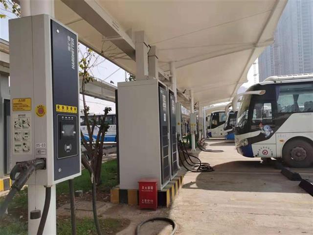省客集团能源分公司总经理陈建林介绍,为满足未来新能源汽车发展的需要,推动节能减排,省客集团积极布局新能源大巴车。今年以来,省客集团在旗下的付家坡客运站、杨春湖客运换乘中心、新荣客运站、新湾修理厂、天河机场交通中心等客运枢纽共建设直流快充大巴充电桩156个,其中新荣客运站数量最大,达到76个。