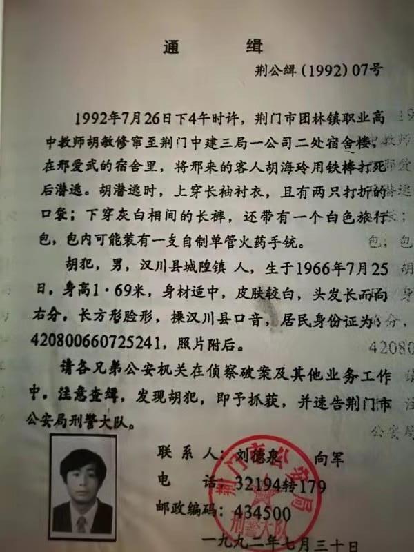 案发当天,东宝公安分局很快查清案情,锁定犯罪嫌疑人胡某。在荆门全市搜捕未果后,于事发后的第三天,发出通缉令,对胡某公开通缉。