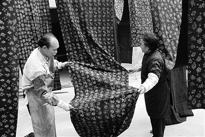 徐州邳州市岔河镇良壁村历史悠久,村中有一棵唐朝的千年古槐和古庙遗迹兴化院遗址等,蔚为壮观。不过来到这里还有一处不能错过,那就是王如坤的蓝印花布染坊和展室。69岁的王如坤是江苏省级非物质文化遗产邳州蓝印花布的传承人,邳州蓝印花布是以邳州当地手工纺织土棉布、天然靛蓝染料手工印染,是邳州传统的民间印染工艺品,王如坤出生于印染世家,除了人民教师的本职工作外,他也成为蓝印花布第五代传承人。他给记者示范如何刻版、如何印染、如何晾晒……拿起院子里晒好的一块深蓝色蓝印花布和另一块浅蓝色蓝印花布,他得意地说:“这种深蓝是我们北派蓝印花布,这种浅蓝色是南派的。”他说经过自己研究总结,蓝印花布分三大流派:“我这个代表北方派,颜色深花纹也比较粗犷,代表我们北方人的豪放、明朗,大汉人的性格是豪放的;苏南和浙江代表南方派,风格比较细腻,花纹比较繁复;还有一派是两湖派……”