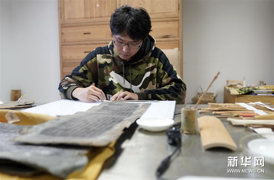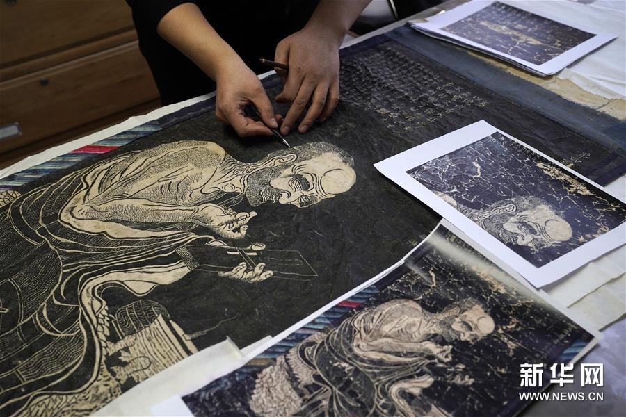 12月3日,一名修复师在修复西藏博物馆藏罗汉拓片。新华社记者金良快摄