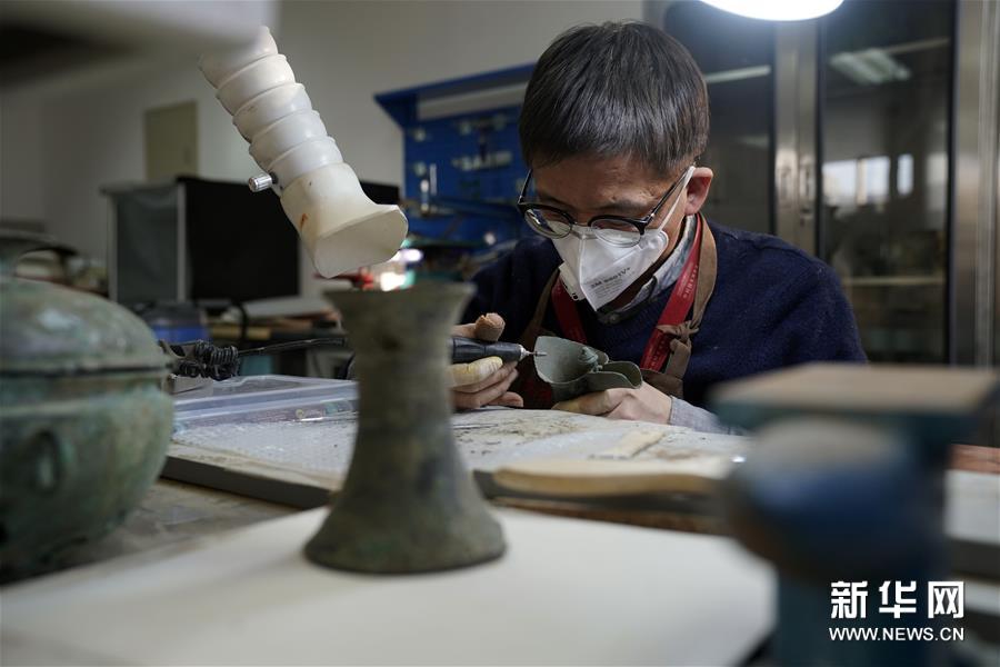 12月3日,文物修复师马立治在修复一件青铜爵。新华社记者金良快摄