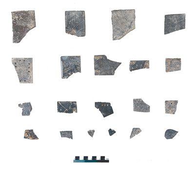 发现的石料均为青色石灰石,部分石片为已经接近制作完成的甲片,表面抛光,有长方形钻孔,边棱和边角经过处理。值得注意的是为了贴合人体曲线,石片被制成正面微鼓、背面微弧的形状。有些石片上还刻有文字,这些特征与秦始皇陵园出土的石铠甲完全一致。根据形状,考古专家认为石片可分别对应甲衣及兜鍪的不同部位。
