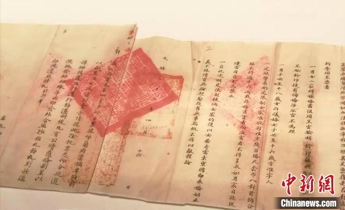 其中一份档案记录了该办法草拟的四条章程,对聘嫁婚书、婚嫁年龄、彩礼数额等都做出了明确的规定。王贞介绍,比如要求结婚得到官府备案,否则不受保护;然后适婚年龄男18岁,女16岁;再有,女方要彩礼,一般折合白银十六两。