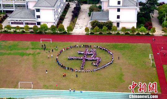资料图。:图为世界读书日,扬州百余名小学生操场拼出巨幅汉字“书”。 孟德龙 摄