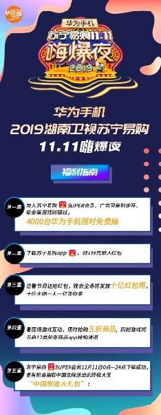 11月8日,苏宁易购与华为联合官宣,华为手机签约成为湖南卫视11.11嗨爆夜总冠名。同时也坐实了4000台免费华为mate 30 5G手机作为“狮晚”奖品的消息。这4000台华为手机将在晚会现场免费抽出,并送给参与晚会互动的苏宁易购SUPER会员们。