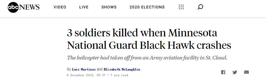 据英国《每日邮报》12月6日报道,当地时间12月5日下午,一架隶属于美国陆军国民警卫队的“黑鹰”直升机在明尼苏达州坠毁,当时机上载有3人。美国广播公司(ABC)最新消息称,3人均已身亡。