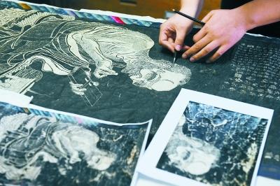 为了找到在色泽和质地上与原画最为相近的纸,王博做了许多尝试:首先要选墨,各种墨都要进行实验,直接染色也不行,需要自己一下一下拓出来,保证光泽、色泽一致。“拓出来的纸会有略微的飞白,染出来是‘死黑’的,阳光下看得很明显。”王博解释说。之后的选纸更有讲究。宣纸拓完之后会分层,他专门找厂家定制了一种纸。“这种纸像棉连纸一样薄,但是韧性更好,利于文物日后保存。”