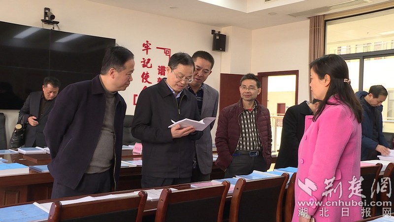 图为:省扶贫办副主任项克强检查扶贫相关资料。通讯员 廖启华 摄