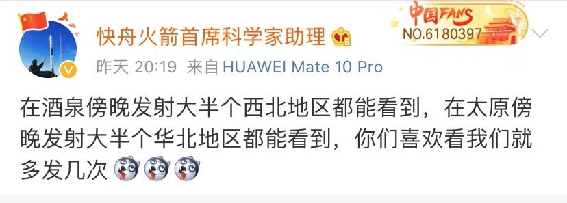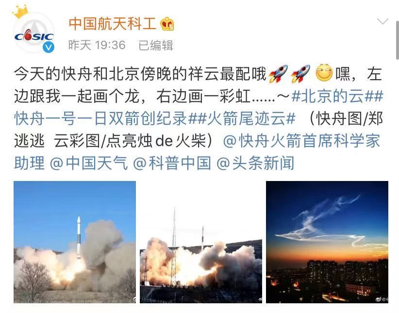 晚上19:15,@快舟火箭首席科学家助理 前来“认领”了这片航迹云: