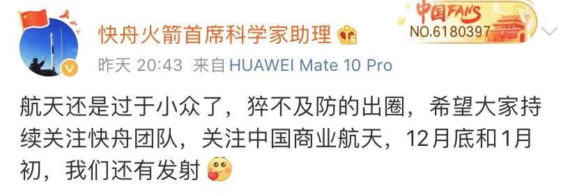 原来是12月7日,太原卫星发射中心发射了两枚快舟一号甲运载火箭。值得一提的是,此举打破了同一发射工位和同一型号火箭发射时间间隔最短纪录。