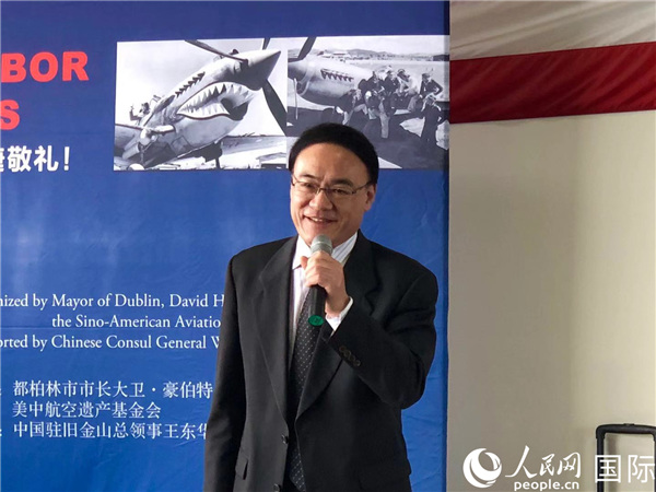 中国驻旧金山总领事王东华在纪念会上致辞,感谢“飞虎队”与中国军民携手抗战,中国人民将永远铭记“飞虎队”为抗战胜利和中美友谊建立作出的伟大贡献。