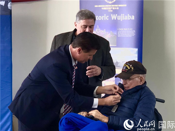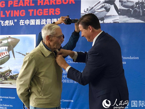 加州都柏林市长豪伯特为两位援华“飞虎队”老将——99岁高龄的哈里·莫耶(Harry Moyer)和梅尔文·麦克穆林(Melvin McMullen)佩戴“都柏林市胸针”,向他们的杰出贡献致敬。他说,人们将永远铭记中美战士在二战中作出的贡献,二战军人是最伟大的一代人。
