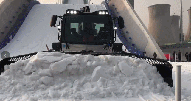 据了解,首钢滑雪大跳台最高点达到60米,出发点达到48米,结构长度164米,最陡坡度约38度,将雪铺到陡坡和最顶端成为颇具难度的任务。在场馆现场,一台工作中的压雪车解开了其中的“奥秘”。