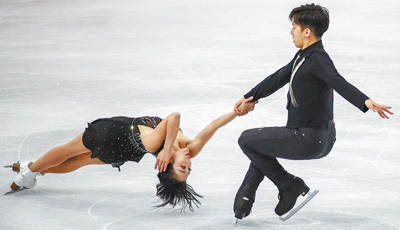 当地时间12月6日,在都灵结束的国际花滑大奖赛总决赛双人滑项目上,中国组合隋文静/韩聪以总分211.69分摘金。图为隋文静(左)/韩聪在双人滑短节目比赛中。