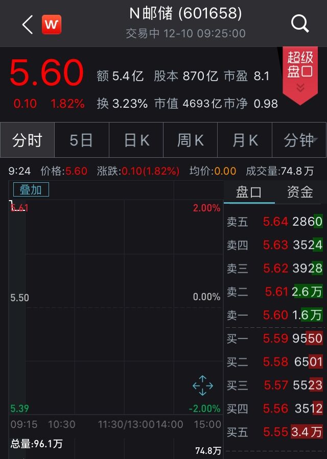 中新经纬客户端12月10日电 10日,股票代码为“601658”邮储银行正式登陆A股,该股高开1.82%,报价5.60元,总市值达4693亿元。至此,国有六大行齐聚A股,并全部实现“A+H”两地上市。
