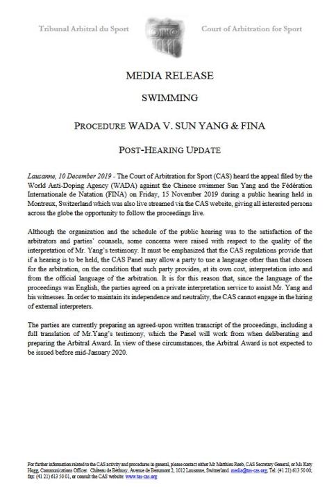 中新网客户端北京12月11日电 当地时间10日,国际体育仲裁法庭官网宣布,因翻译不准确,双方需要再度提供笔录等原因,原定于2020年1月初宣判的孙杨听证会,将推迟至1月中旬后再公布仲裁结果。