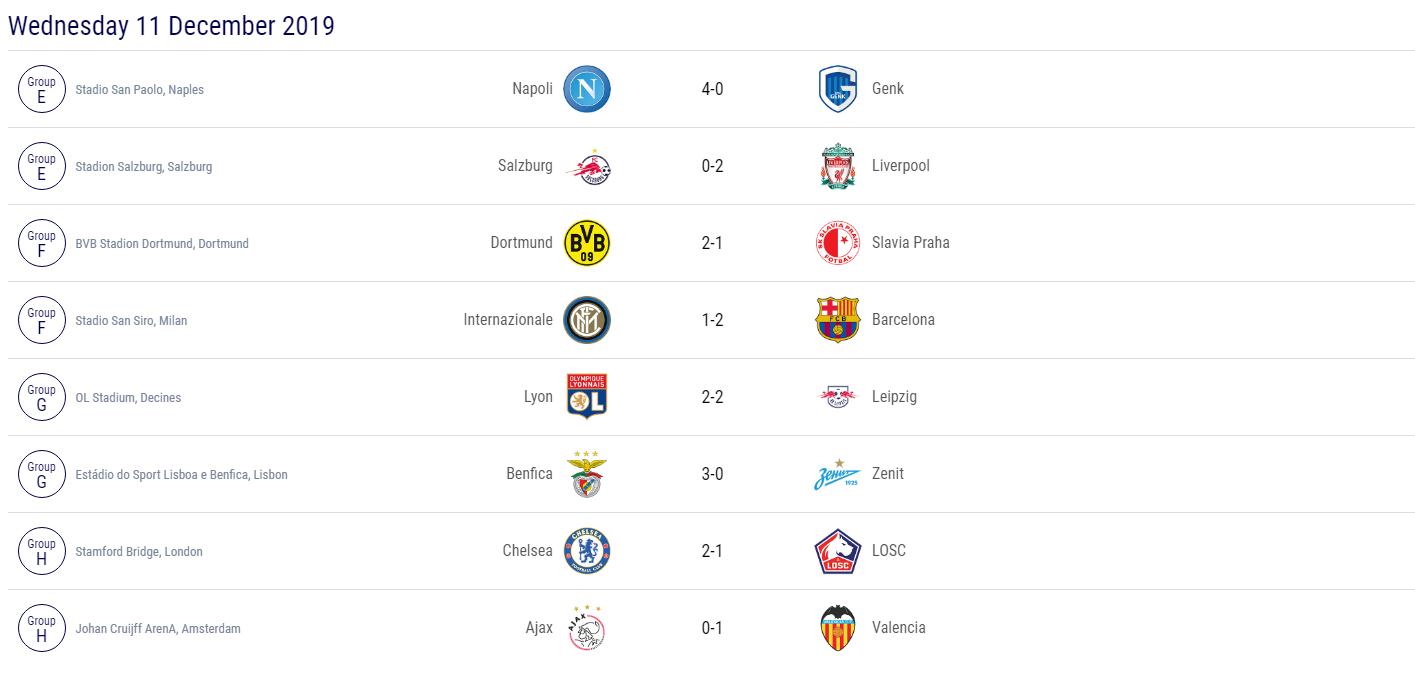 欧冠小组赛末轮第一比赛日的8场战况。图片来源:欧冠官网。