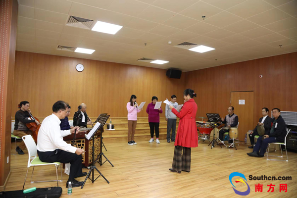 在拱北联安市民艺术中心两地市民正在老师带领下排练粤剧作品。张国勤摄