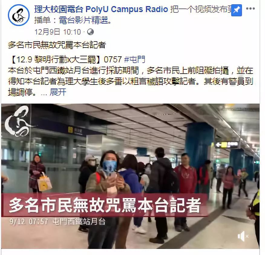 12月9日,反对派又欲强行制造所谓的“三罢”。脸书账号 “理大校园电台 PolyU Campus Radio”9日发出贴文声称,理大学生记者当天在采访期间被香港市民“无故咒骂”,后有警员到场调停。并附上了一段现场视频。