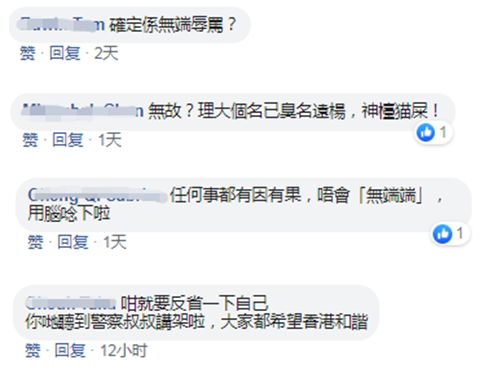 对于这些说法,有香港网民在评论区质疑,真的是“无端”辱骂?任何事情都有因有果,用脑袋想一下啦;要反省一下自己,你们听到警察叔叔讲啦,大家都希望香港和谐↓