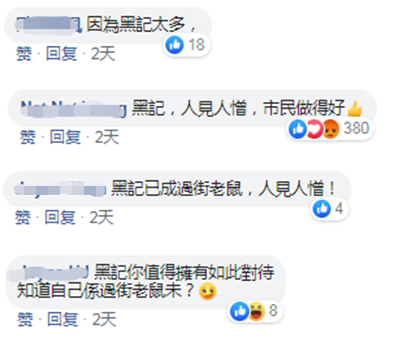 还有网民直言,因为“黑记”太多;“黑记”人见人憎,市民做得好;“黑记”只得如此对待,知道自己是过街老鼠吗?↓