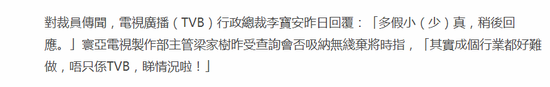 网易娱乐12月12日报道 据港媒报道,TVB月底将裁员近千人,其中制作部和综艺组影响最大。据悉现在TVB所有员工大约有4000人,前段时间就有少量艺人被裁。有媒体就此采访了TVB行政总裁,他就表示此消息:“多假小真,稍后回应。”据悉这次裁员将会有800到1000名员工被裁。