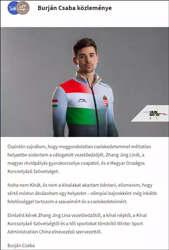 10日,匈牙利短道速滑运动员布尔扬·乔巴在匈全国滑冰协会官网发表正式声明,就其涉华不当言论道歉。