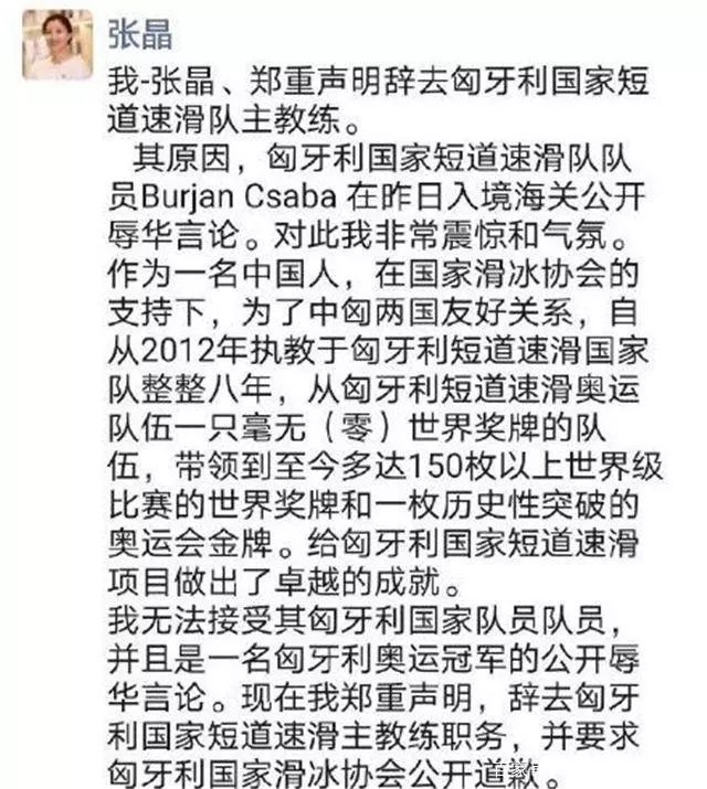昨晚(12月3日),匈牙利国家短道速滑队主教练张晶突然宣布辞职。而她愤而辞职的原因是:自己所在的短道速滑队队员、平昌冬奥会男子短道速滑5000米接力冠军成员Burjan Csaba公然辱华。