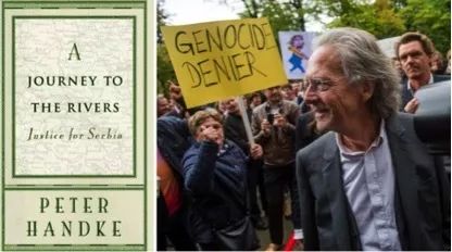 截图为汉德克的引发争议的那本书,以及抗议者抨击他是“大屠杀否认者”