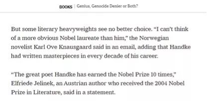 毕竟,《纽约时报》在一篇名为“天才、大屠杀否认者,还是两者皆是”的报道中,就引用欧洲其他文坛名人的观点称:汉德克在文学上的才华,确实比其他人更配得上诺贝尔奖。