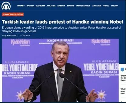 同时,继土耳其驻瑞典大使2天前宣布拒绝出席颁奖典礼后,土耳其总统埃尔多安也于昨天(12月11日)公开批判了将诺贝尔文学奖颁给汉德克的决定。根据土耳其媒体的报道,埃尔多安还感谢了那些抗议这一颁奖决定的各国官员和示威者。