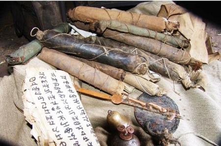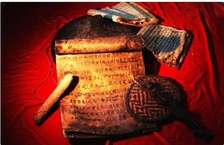 毕摩文献与法具。阿牛史日萨古曲惹摄
