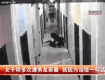 楼道监控视频显示,一名男子将一名女子拽出房间,左手拉住女子的头发,右手将女子一拳打倒在地,后又向倒地女子头部附近连挥数拳。