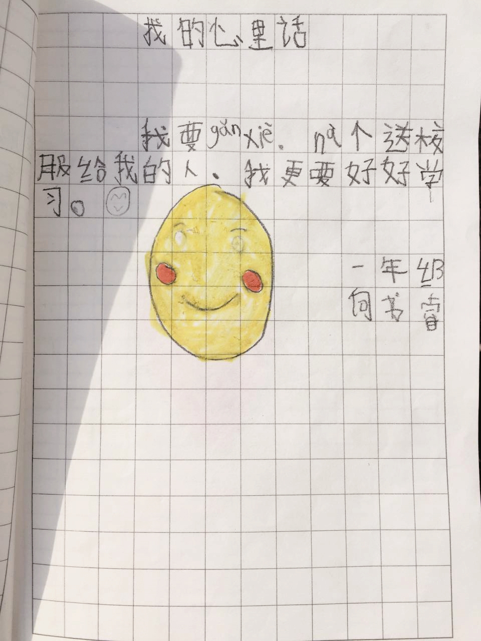 “送给我的校服真好春(看),爸爸妈妈dougaoxing!”这是一年级学生石家萱写的;“na个人shong(送)gei我的xinyifuzeng(真)好看,我hengandong。”是一年级的王嘉熙写的;“shui送给校fu真meili!”是一年级的洪雅茹写的;“我要ganxie,na个送校服给我的人,我更要好好学习。”一年级学生向书睿写到。