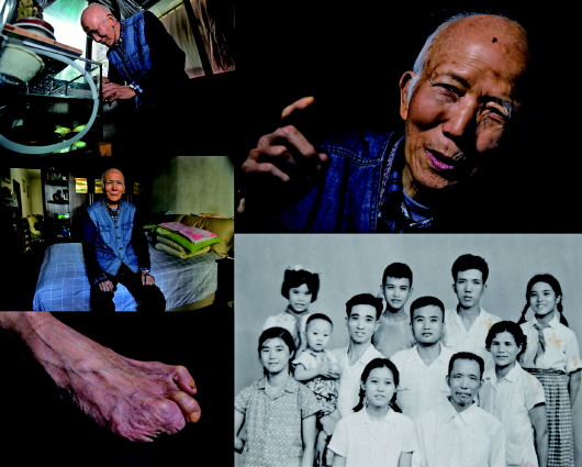 右上:周文彬在讲述经历;右下:上世纪60年代周文彬(后排右二)和父亲周忠义(前排右一)、大哥周文鑫(第二排右二)等家人的合影(翻拍照片);左上:周文彬在家侍弄自己养的观赏鱼;左中:周文彬在家中卧室内;左下:周文彬展示遭日本兵枪击成为残疾的左脚(拼版照片,11月15日摄)。