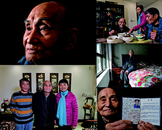 左上:徐家庆肖像;左下:徐家庆和女儿徐晓霞、女婿张高明在家中合影;右上:徐家庆在家中吃午饭;右中:徐家庆在自己卧室内;右下:徐家庆在展示自己的南京大屠杀幸存者证(拼版照片,11月26日摄)。
