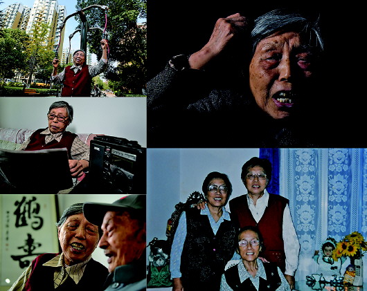 右上:方素霞在讲述当年经历;右下:1994年,幸存者方素霞(后右)和大姐方素珍(前),二姐方素英合影(翻拍照片);左上:方素霞在自家小区内锻炼身体;左中:方素霞在家中阅读报纸;左下:方素霞在家中和老伴周文书聊天(拼版照片,11月13日摄)。