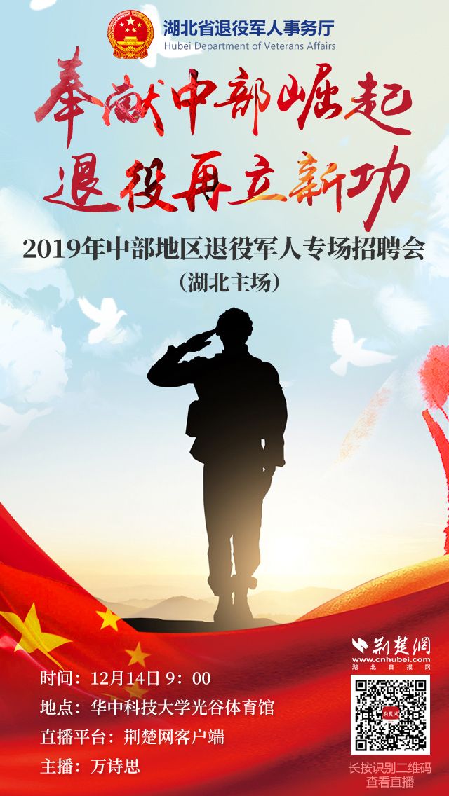 荆楚网客户端—荆楚网消息(记者邱玲鹏 通讯员包晓霁)12月14日上午,中部地区退役军人专场招聘会(湖北)将在华中科技大学光谷体育馆拉开序幕。