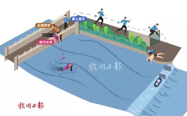 △事发地 他们跳落的七格渠刚刚放过闸,水深三四米,水流也比较急。周围居民赶紧打电话报警,社区接到报警后第一时间跟巡防赶到现场,关掉闸门,打捞搜救。下沙消防中队接警后也迅速赶到现场救援,但噩耗接连传来:晚上8点55分,跳河女孩先被打捞上来,没有了生命体征;晚上11点20分,张雪领也被救起,可惜已没有呼吸……