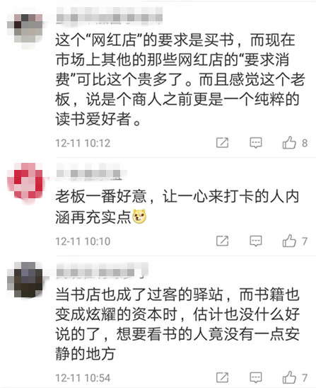 “规定必须买一本书的话,那些只想拍照炫耀的人可能就不会来了。”有网友认为,老板提出这条规定,其实是无奈之举,只是希望为爱书人营造一个好一点的阅读环境。